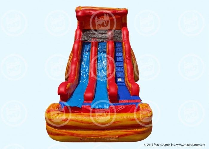 Magic Jump is back with a great new addition to our line of wet and dry inflatable slides. Our 17 Flammin Wave Dual Slide is the one of the newest addition to our slide family. Many days and weeks of research and development have gone into designing this beautiful slide. We have worked hard to make sure you don't have to. It is made compact and lightweight to make for easy setup and cleanup for rental operations. The slide features a easy-to-use water misting system that you will not have to remove and install or constantly re-adjust. The climbing area, top landing platform, and certain pool areas feature a unique non-slip material for a safer experience when being used as a water slide. The 17 Flammin Wave Dual Slide has a full pool with a raised wall for safety and to prevent water from splashing out. For states that do not allow pools, we can swap out the pool for a landing mattress. Drain flaps at the bottom corners allow for easy removal of any water that may get trapped inside the inflatable