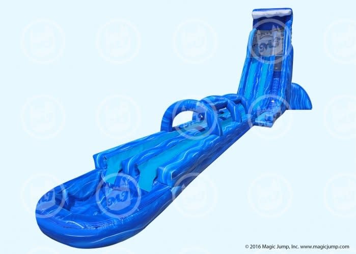 The 37' North Shore inflatable is a giant dual lane water slide which is 2 pieces for ease of transportation and setup. The Slide N Splash and Slide portions both have zippers to make it easy to deflate during pickup time. The North Shore water slide can be setup and rolled up by 4 people. There is no other giant water slide this tall and easy to setup or pickup. Our water slides are made using only the best commercial grade material.