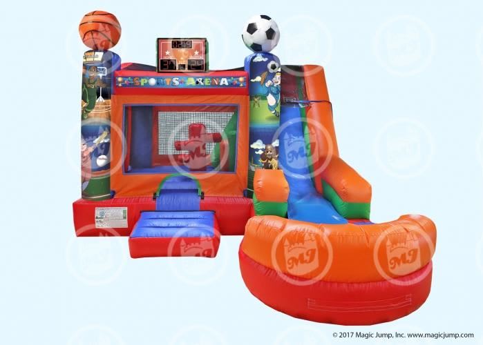 New for 2018 is Magic Jump’s very first 6-in-1 Combo unit. Decorated as a sports arena, this 6-in-1 Sports Combo Wet or Dry has something for every athlete to enjoy with imagery from four major sports: baseball, basketball, soccer and football. This Wet or Dry combo ride features six different obstacles activities: (1) a bigger bouncing area; (2) a basketball hoop; (3) inflated push-through, obstacle pop-ups; (4) a wall climber; (5) a “high platform” wet or dry slide; and (6) a removable pool/landing for wet use.