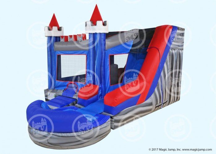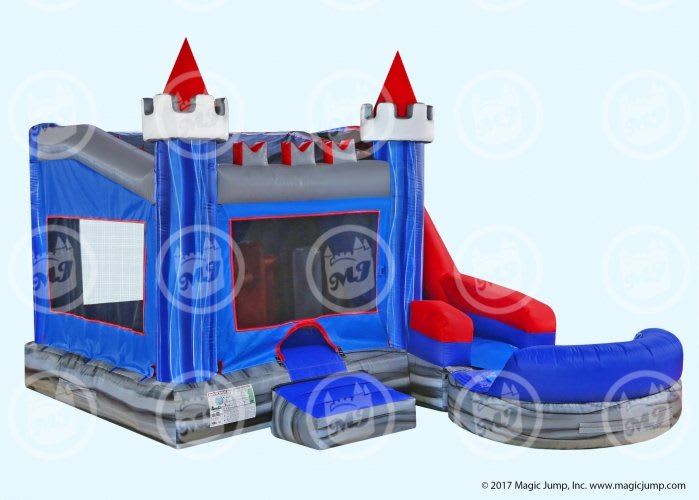 New for 2018 is Magic Jump’s very first 6-in-1 Combo unit. With a castle-like design and royal blue & silver color theme, this 6-in-1 Medieval Combo Wet or Dry provides a medieval feel and an attractive twist on the traditional Castle Bouncy Castle design. This Wet or Dry combo ride features six different obstacles activities: (1) a bigger bouncing area; (2) a basketball hoop; (3) inflated push-through, obstacle pop-ups; (4) a wall climber; (5) a “high platform” wet or dry slide; and (6) a removable pool/landing for wet use.