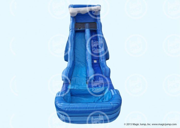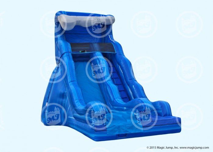 Magic Jump is back with a great new addition to our line of wet and dry inflatable slides. Our 17 Wave Slide is the one of the newest addition to our slide family. Many days and weeks of research and development have gone into designing this beautiful slide. We have worked hard to make sure you don't have to. It is made compact and lightweight to make for easy setup and cleanup for rental operations. The slide features a easy-to-use water misting system that you will not have to remove and install or constantly re-adjust. The climbing area, top landing platform, and certain pool areas feature a unique non-slip material for a safer experience when being used as a water slide. The 17' Wave Slide has a full pool with a raised wall for safety and to prevent water from splashing out. For states that do not allow pools, we can swap out the pool for a landing mattress. Drain flaps at the bottom corners allow for easy removal of any water that may get trapped inside the inflatable