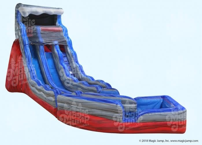 Magic Jump is back with a great new addition that is based off of our 20 Wave Slide series. Our 20 Dual Drop Wave Slide is the one of the newest addition to our slide family with two different slide platform heights. It is made compact and lightweight to make for easy setup and cleanup for rental operations. The slide features a easy-to-use water misting system that you will not have to remove and install or constantly re-adjust. The climbing area, top landing platform, and certain pool areas feature a unique non-slip material for a safer experience when being used as a water slide. The 20 Dual Drop Wave Slide has a full pool with a raised wall for safety and to prevent water from splashing out. For states that do not allow pools, we can swap out the pool for a landing mattress. Drain flaps at the bottom corners allow for easy removal of any water that may get trapped inside the inflatable